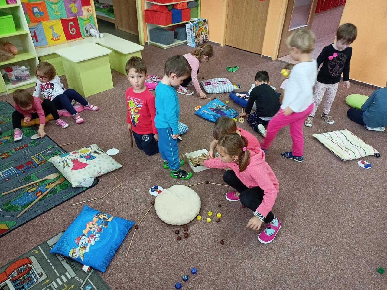 Hrajeme si, cvičíme, ochutnáváme ovoce, pouštíme draka, pečeme pro sv. Martina, neseme krmení do krmelce, užíváme si divadlo, povídáme si s myslivcem...