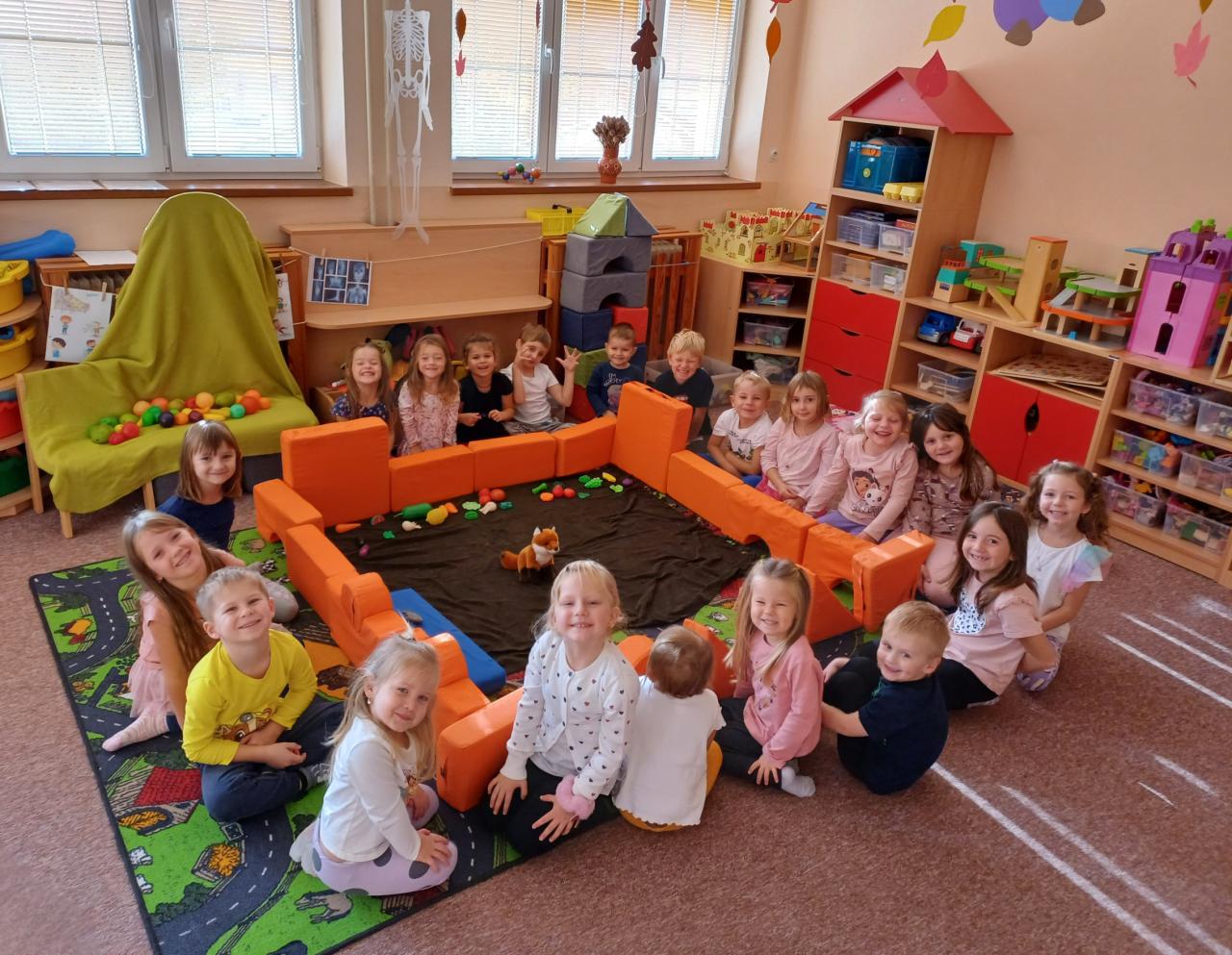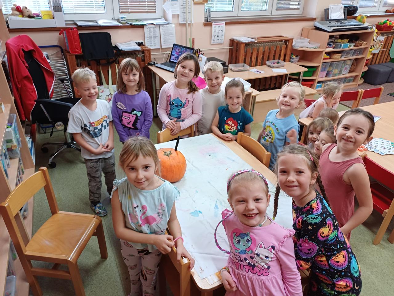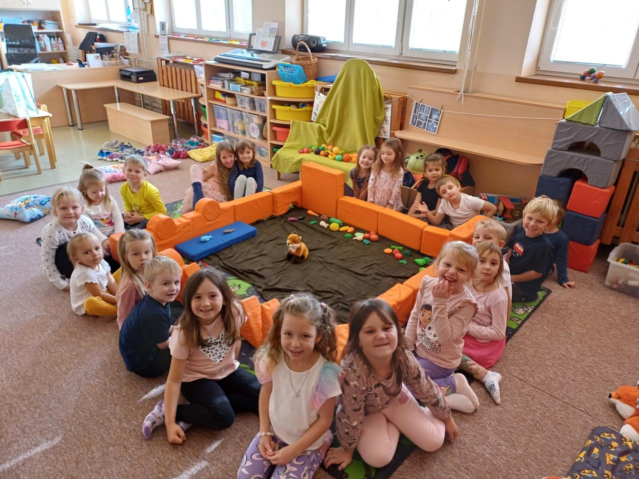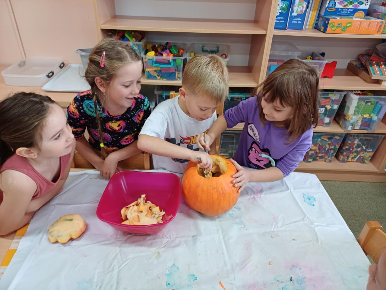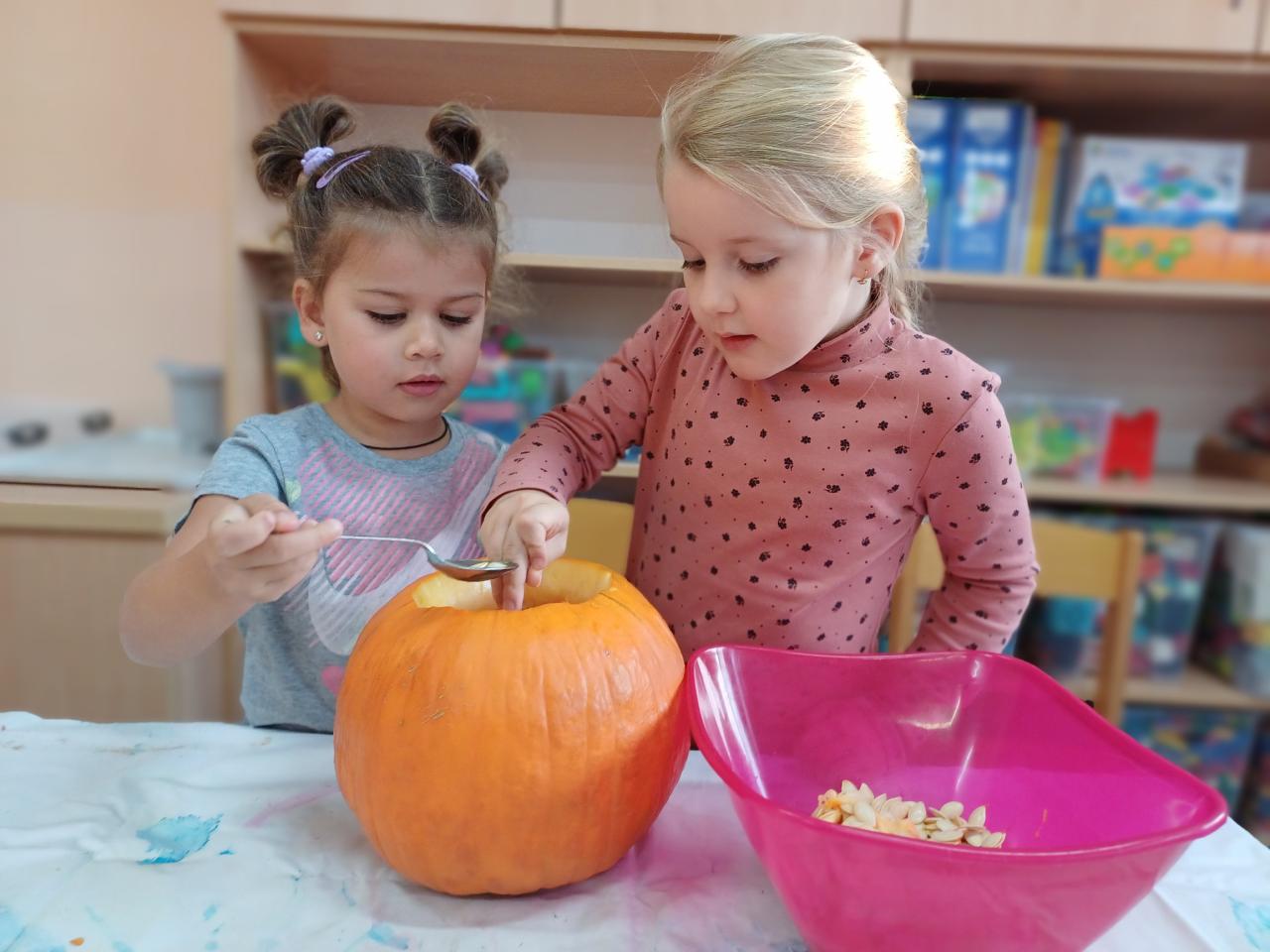 Podzimní hraní venku i vevnitř, společné dlabání dýně, divadlo ve školce - O Budulínkovi, pěstování ovoce a zeleniny, perníkové podkovy sv. Martina, obdivování prvního sněhu, vzdělávací program pro předškoláky První pomoc zážitkem, tvoření v Podzimní rodinné dílně.