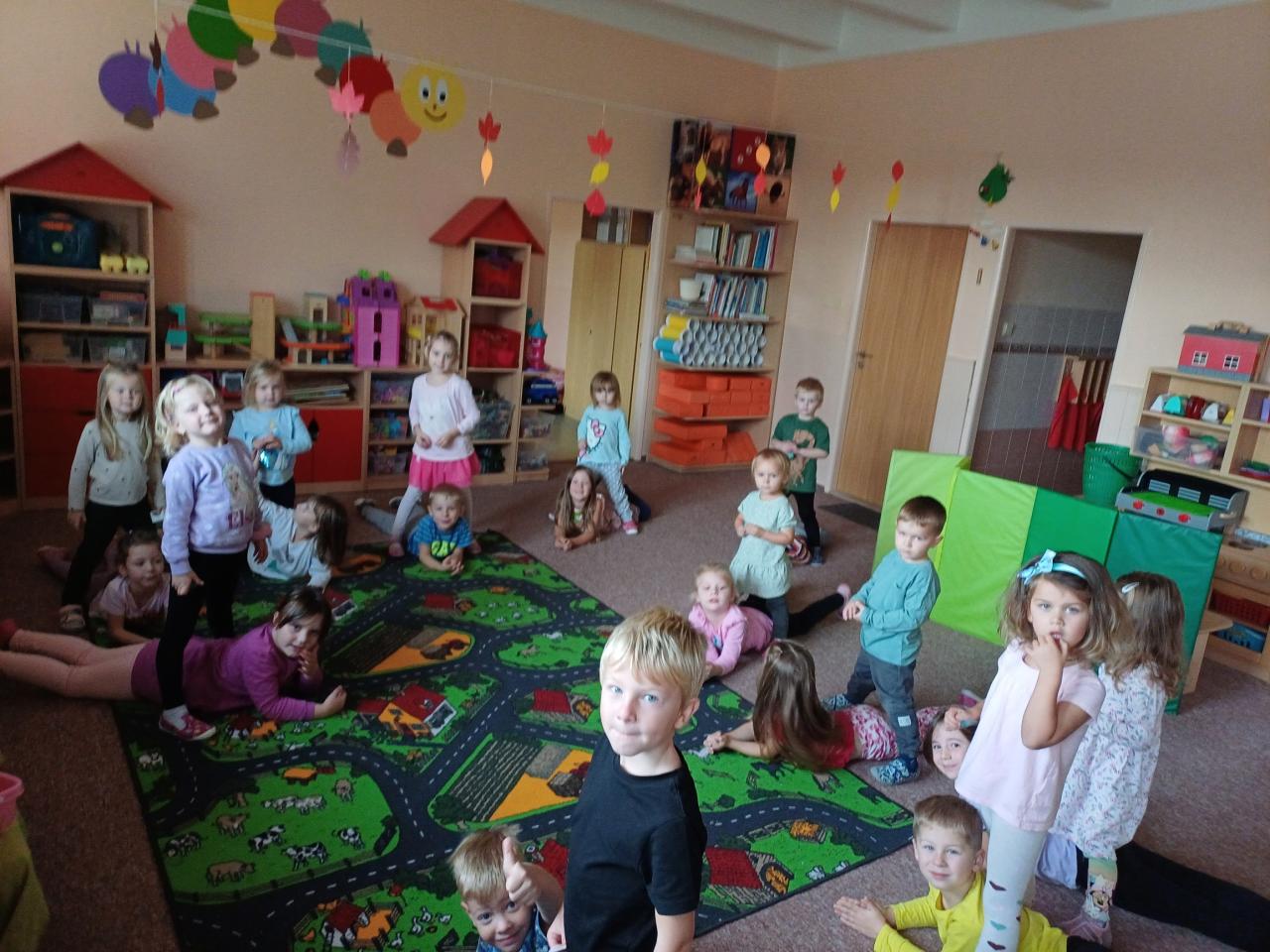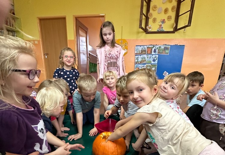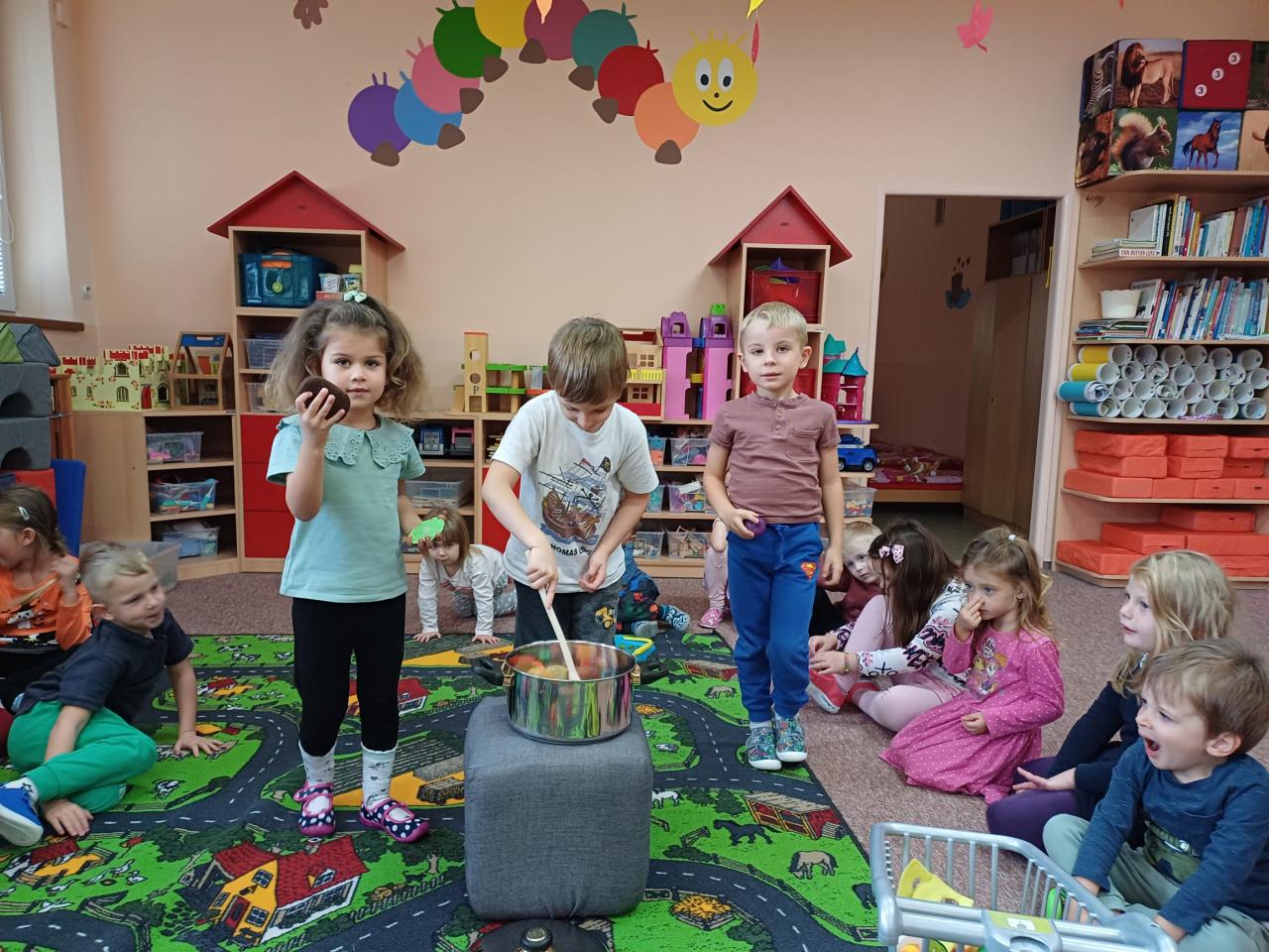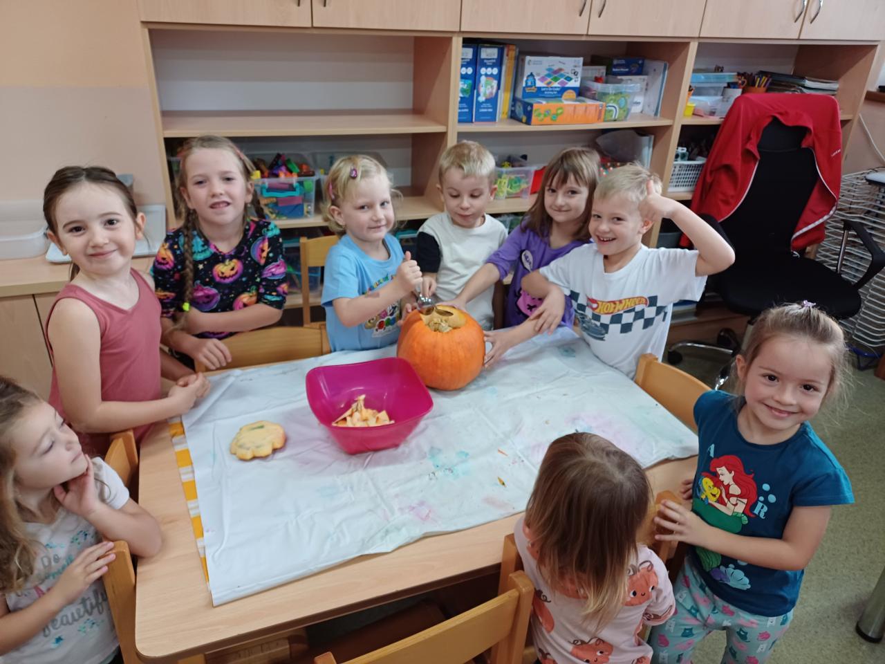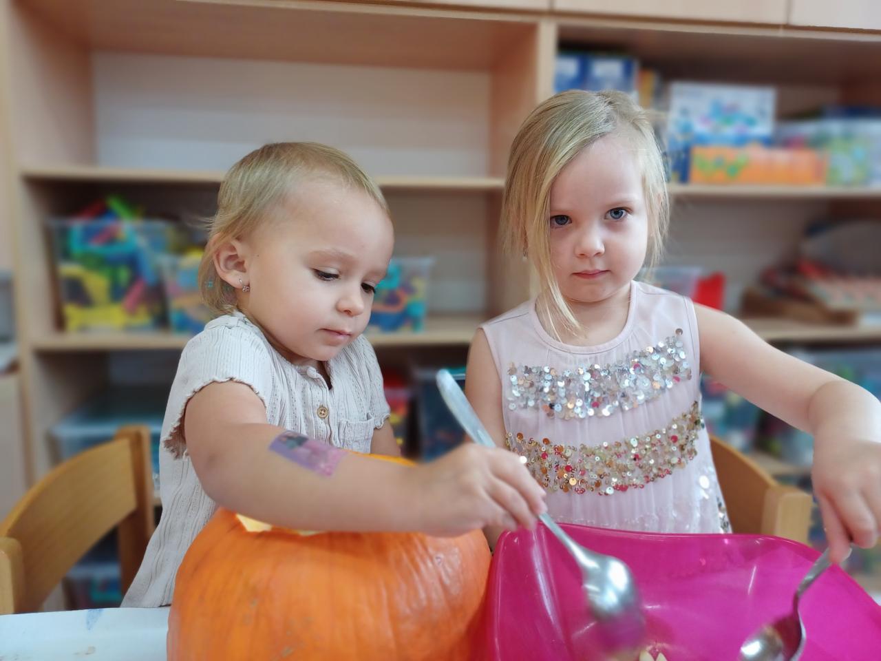 Podzimní hraní venku i vevnitř, společné dlabání dýně, divadlo ve školce - O Budulínkovi, pěstování ovoce a zeleniny, perníkové podkovy sv. Martina, obdivování prvního sněhu, vzdělávací program pro předškoláky První pomoc zážitkem, tvoření v Podzimní rodinné dílně.