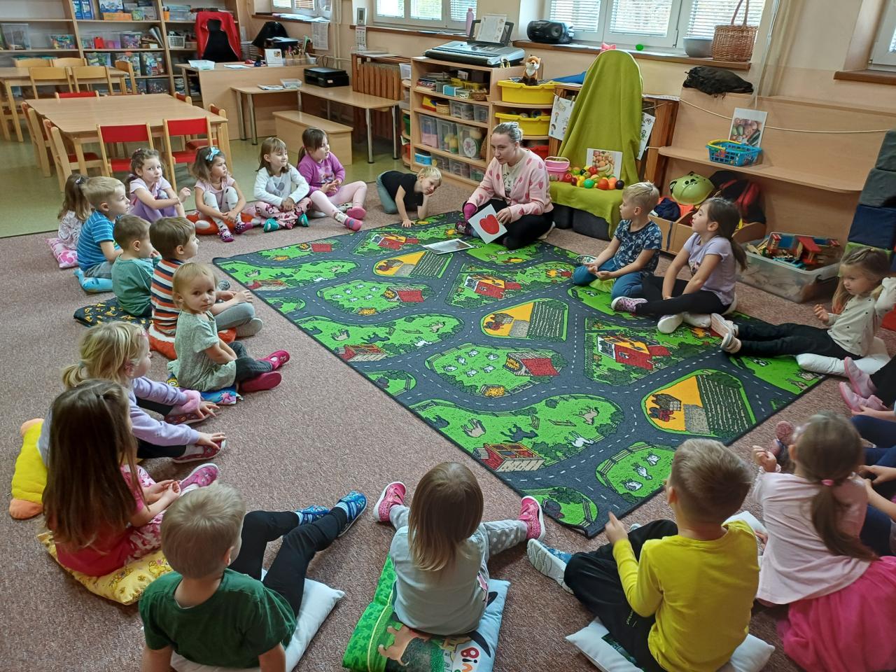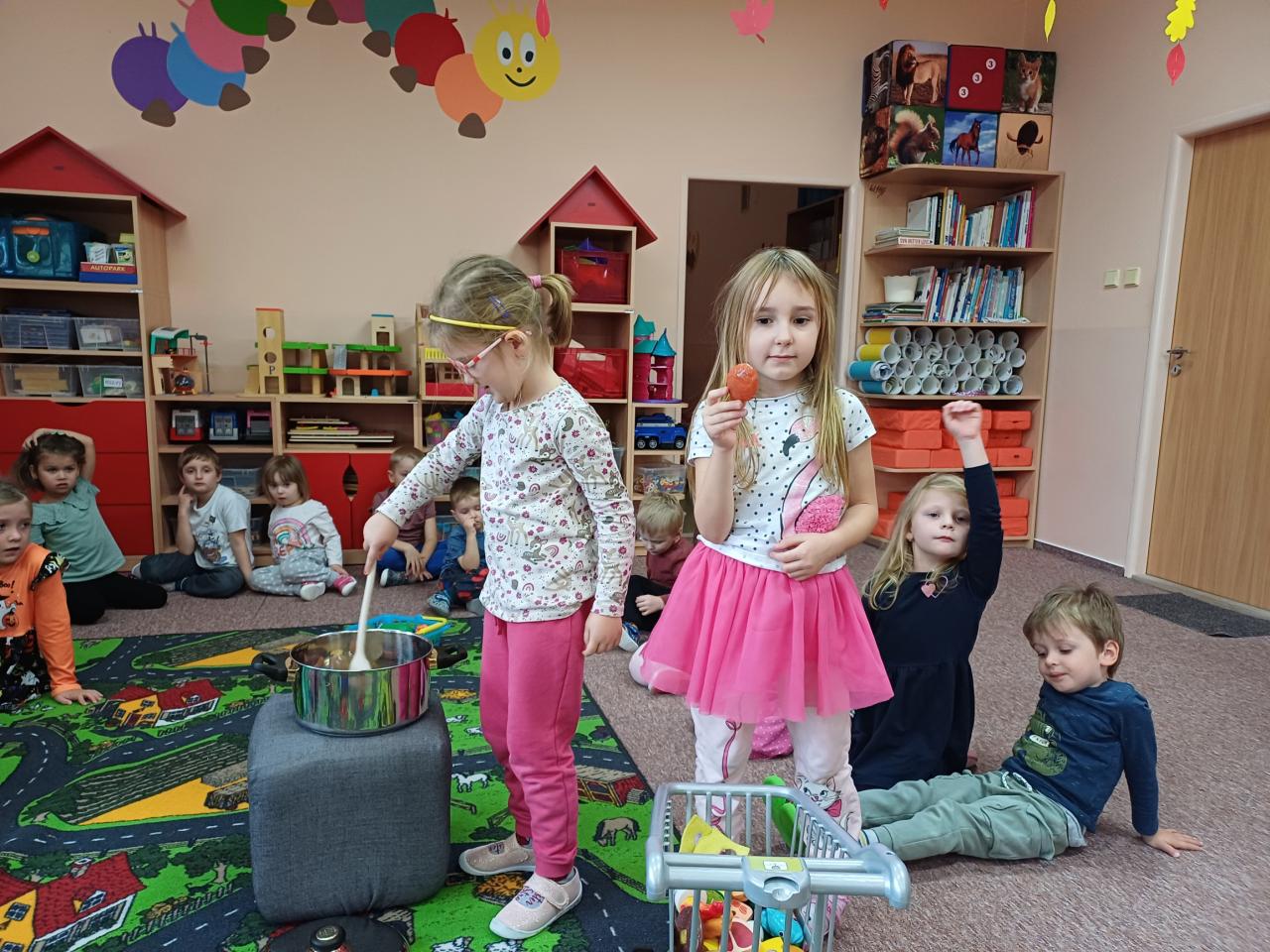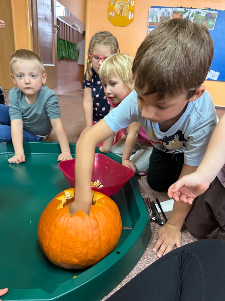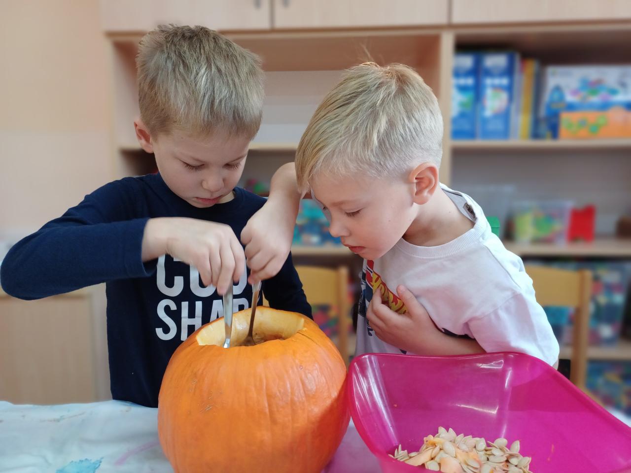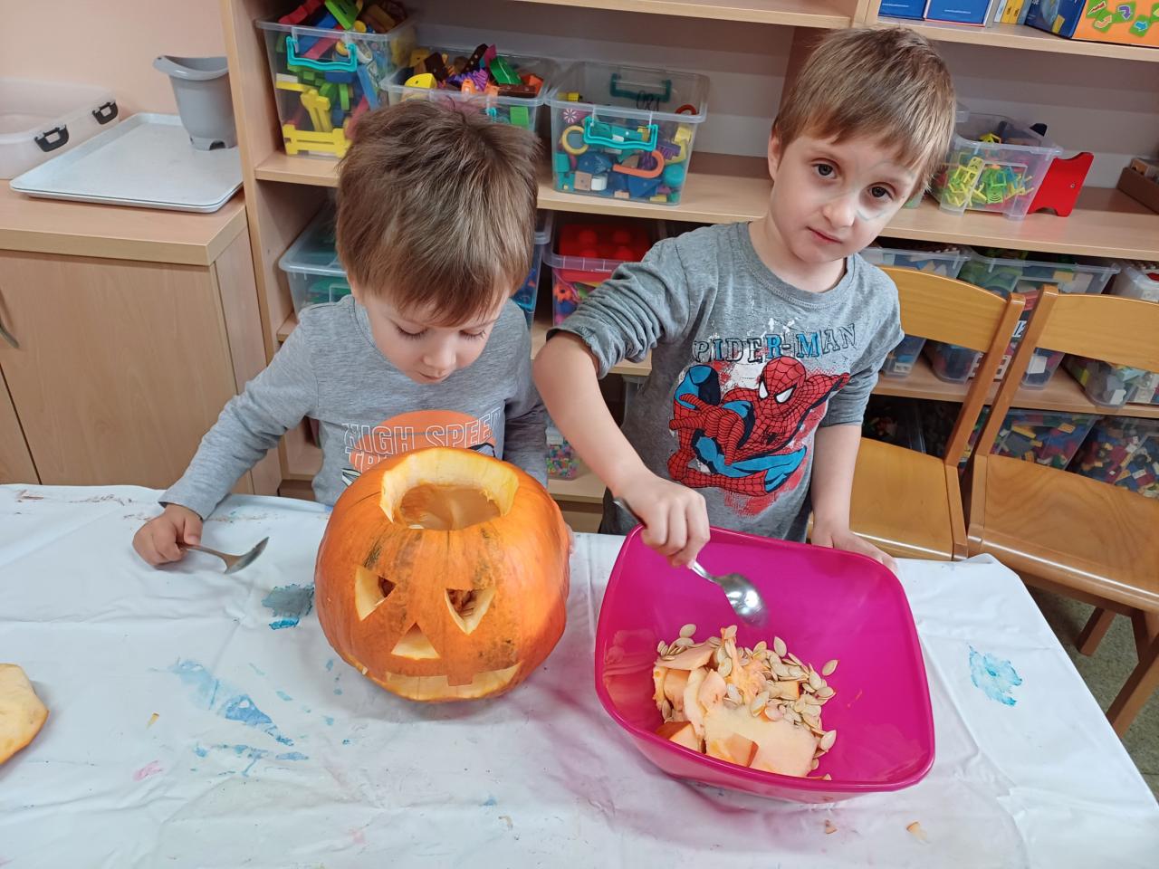 Podzimní hraní venku i vevnitř, společné dlabání dýně, divadlo ve školce - O Budulínkovi, pěstování ovoce a zeleniny, perníkové podkovy sv. Martina, obdivování prvního sněhu, vzdělávací program pro předškoláky První pomoc zážitkem, tvoření v Podzimní rodinné dílně.