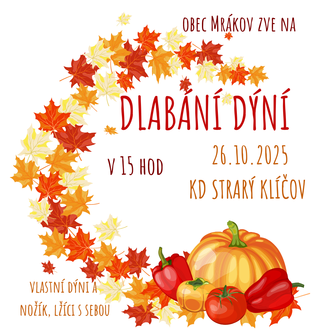 Obec Mrákov a ženy ze SPOZ zvou všechny děti a jejich rodiče na tradiční dlabání dýní, které se uskuteční 26.10.2025 od 15 hodin v sále KD Starý Klíčov (viz. příloha)